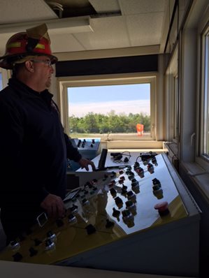 As part of the re-certification, a Fire Service Instructor coaches each participant prior to testing, providing instruction on the safe handling and approach of aircraft rescue and firefighting vehicles, use of the wind for best advantage when establishing an evacuation route, as well as the pump-and-roll technique, wherein the vehicle continues to drive while the hose is engaged.