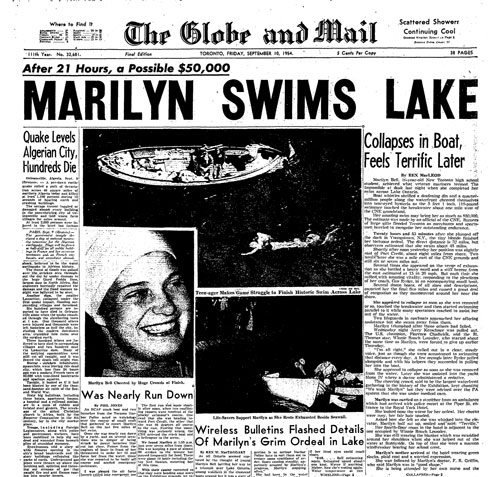 A Toronto native, Bell decided to attempt the swim after a $10,000 prize was offered by the Canadian National Exhibition to an American world-champion swimmer if she could cross the lake. Marilyn felt that a Canadian should also make the attempt despite the fact that the prize was not offered to her. While both swimmers set off on the same day, only Bell successfully made the crossing and was awarded the prize, winning the hearts of Canadians everywhere.